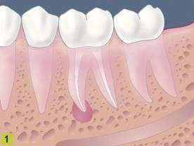 - Ausgangssituation: Das Gewebe um die Wurzelspitze sowie die Wurzel selbst weisen eine Entzündung auf.