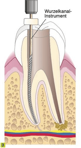 - Die Wurzelkanäle müssen zunächst mit feinen Instrumenten und desinfizierenden Spüllösungen vom infizierten Gewebe gereinigt werden.