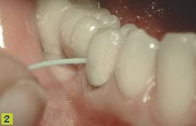- Greifen Sie das Ende und reinigen Sie die Zahnfläche durch leichte Auf- und Abbewegungen. Danach kann die Zahnseide unter dem Zwischenglied der Brücke hindurch zum anderen Brückenpfeiler geführt werden.