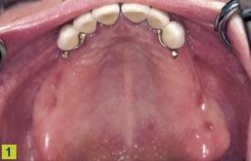 - Ausgangssituation: Zunächst werden die Frontzahnkronen angefertigt. An diesen sind die Geschiebe-Primärteile befestigt.