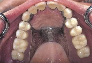 - Endsituation: In der Schlussbissposition fügt sich die Prothese harmonisch in das Restgebiss ein.